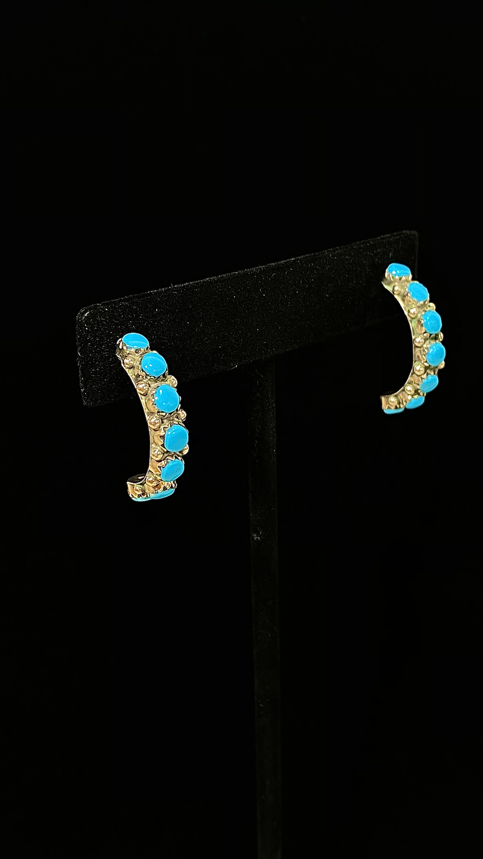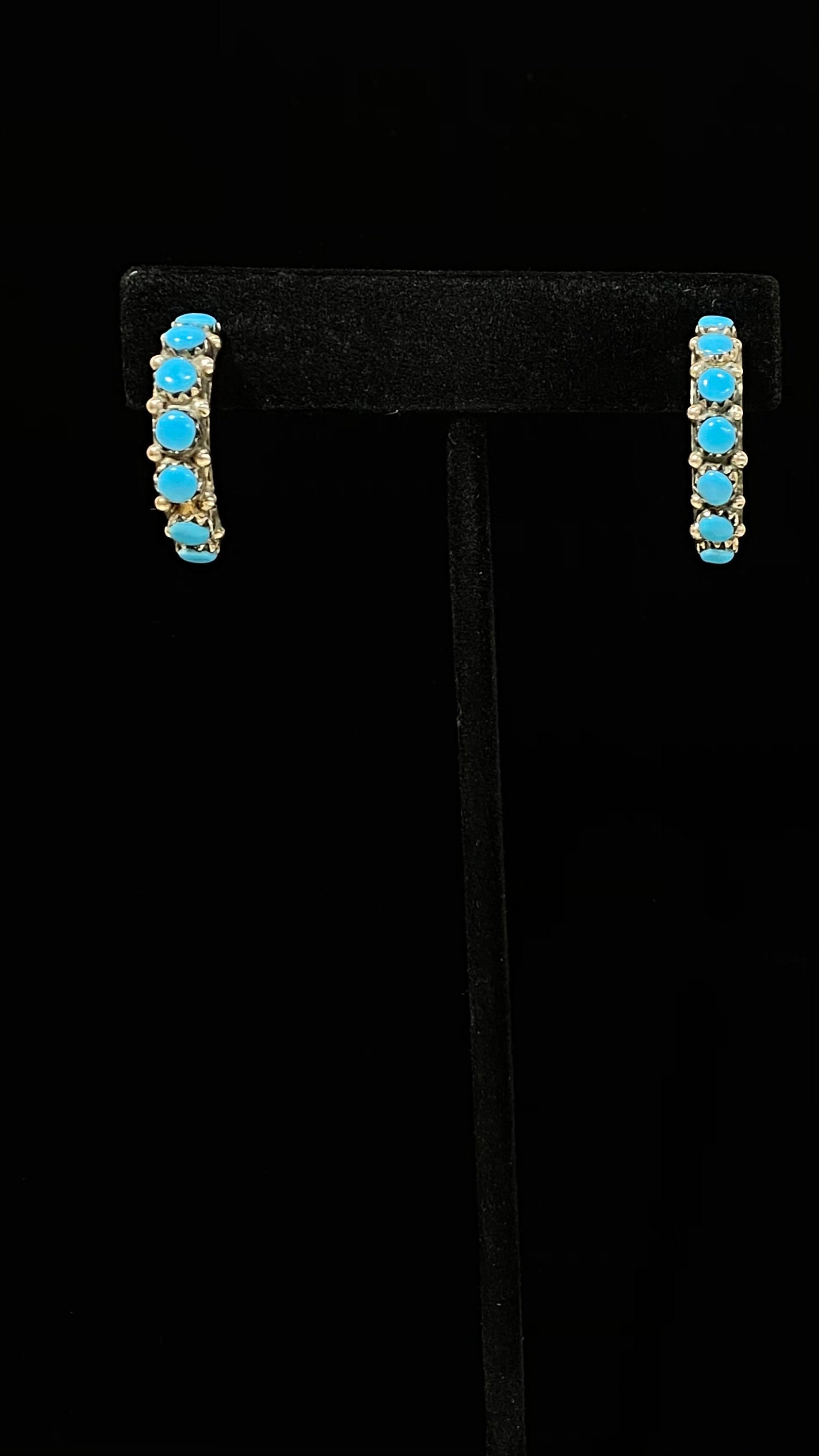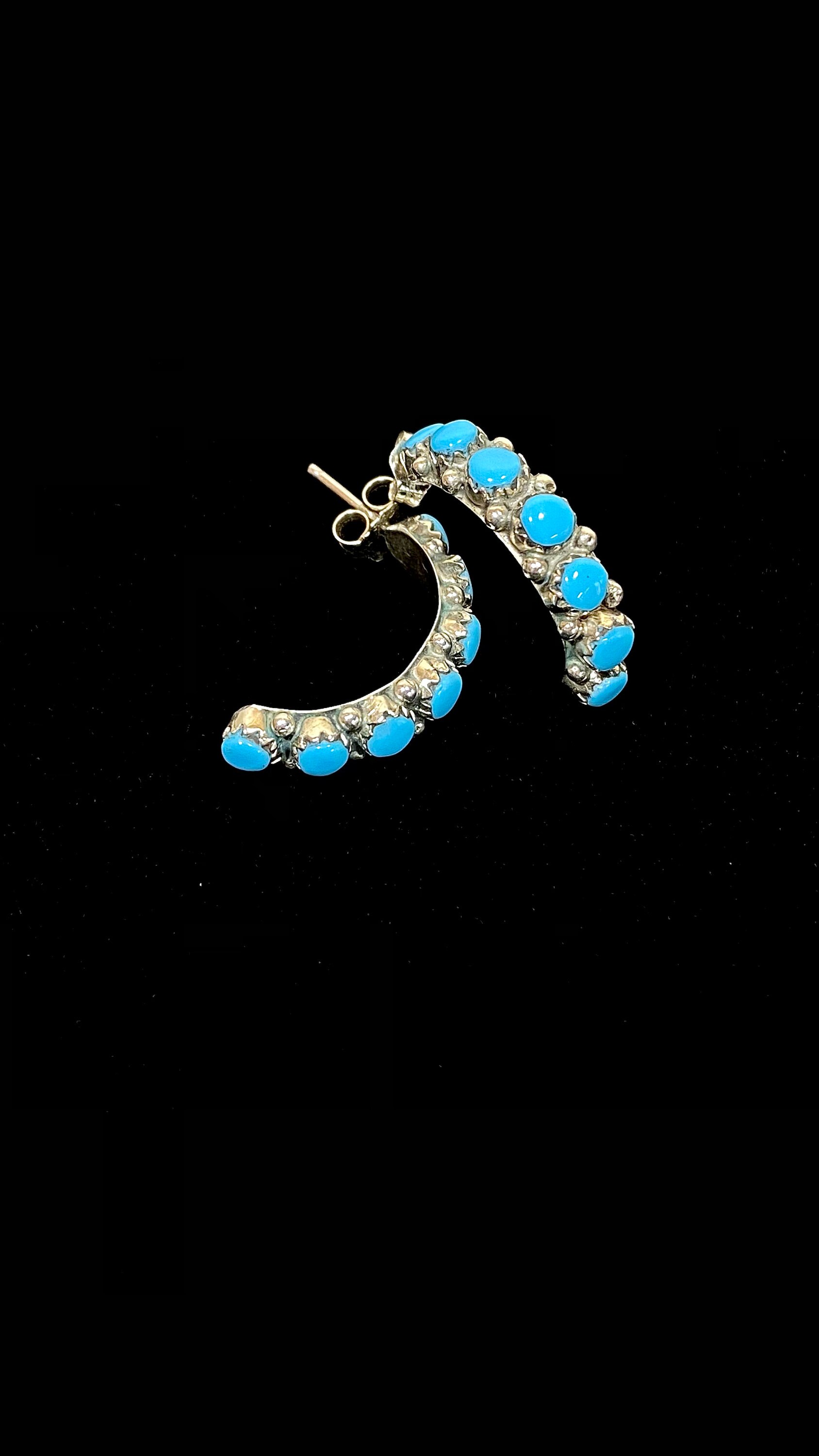 Petite & Perfect Sterling Silver 14 Stone Half Hoops In Lovely Turquoise Blue. These vintage hoops have mismatched butterfly posts with the one with a snugger fit marked CW 925. Their total length is ~ 1” x 3/16” wide weighing 3.3 grams.