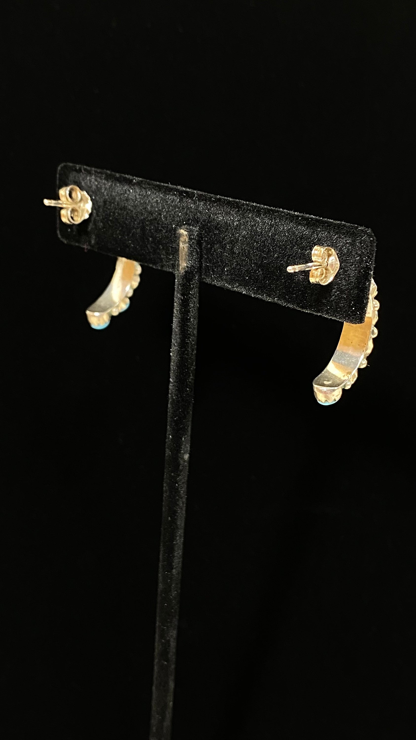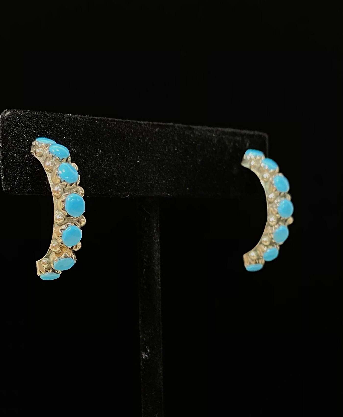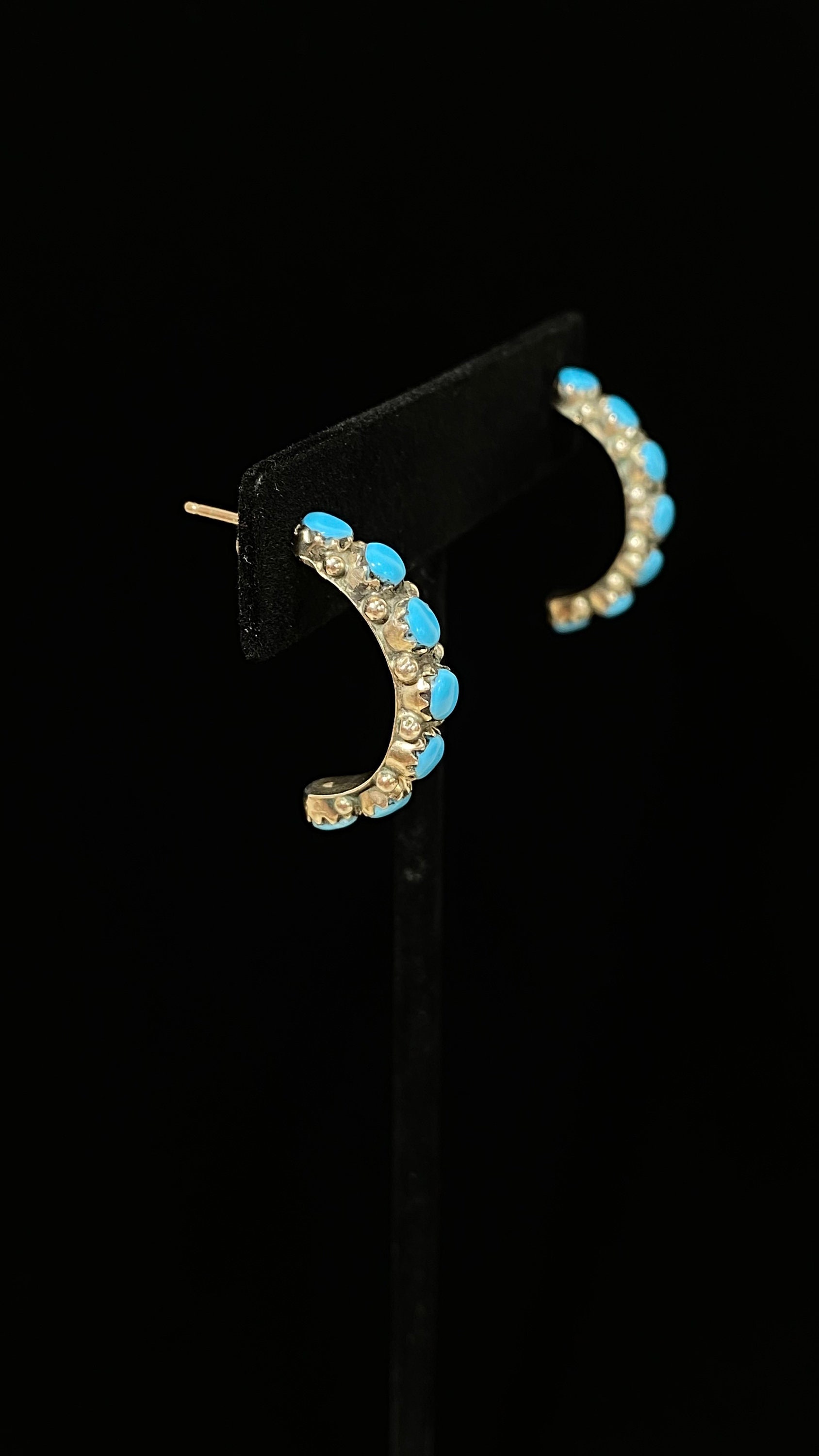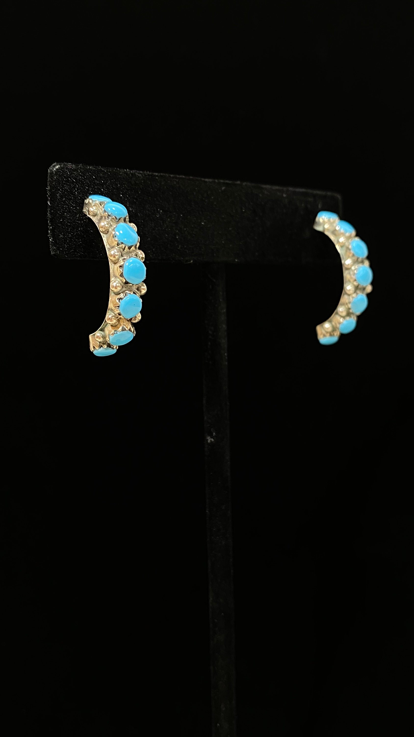 Petite & Perfect Sterling Silver 14 Stone Half Hoops In Lovely Turquoise Blue. These vintage hoops have mismatched butterfly posts with the one with a snugger fit marked CW 925. Their total length is ~ 1” x 3/16” wide weighing 3.3 grams.