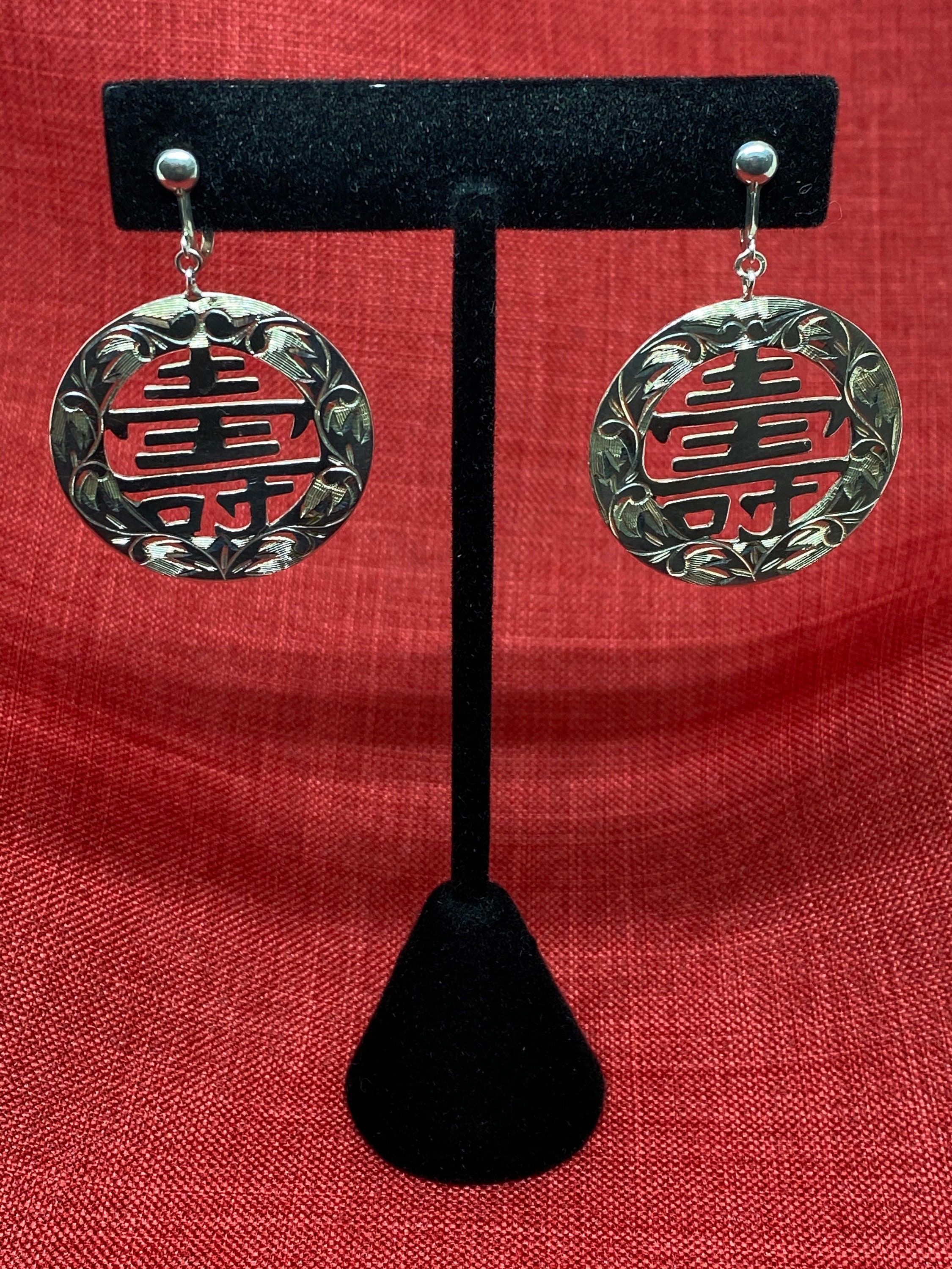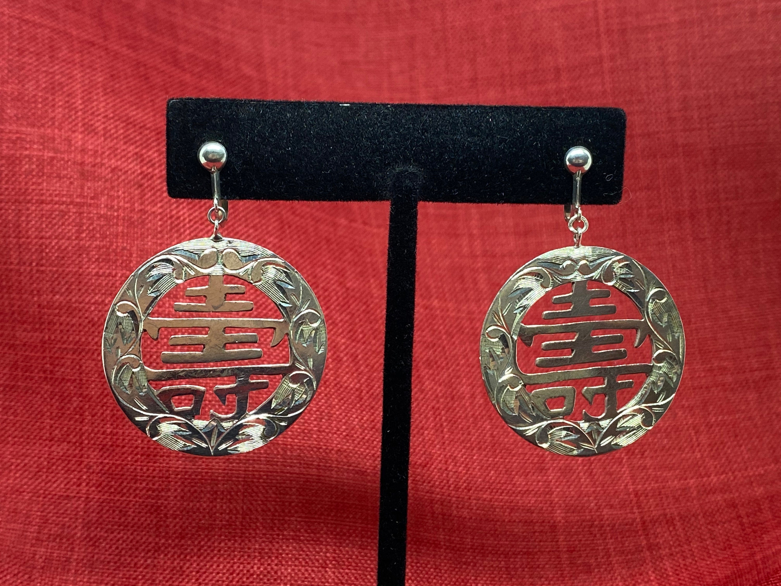Vintage 950 Sterling Silver Chinese Character Drop Earrings feature the symbol for long life measuring a total length of 1 3/4” long and diameter of 1 1/4” long weighing 9.5 grams.